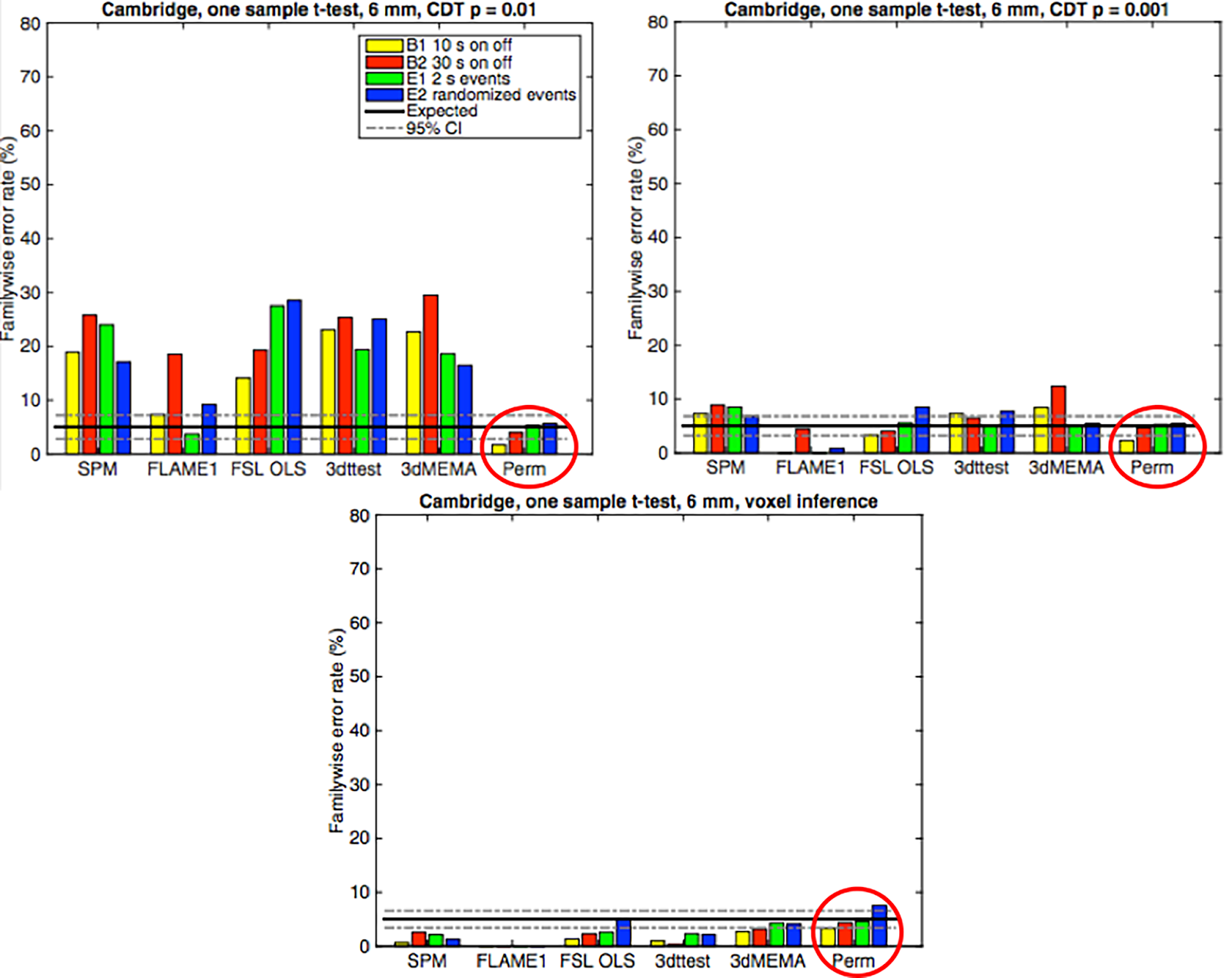 Figure 1 from Eklund et al (2016). Simulations on an open-access dataset for different block and event-related designs. Upper left: Cluster-defining threshold (CDT) of p = 0.01 uncorrected; upper right: CDT of p = 0.001 uncorrected; bottom: voxel-level inference. Black line: Expected false positive rate of 5%. A threshold of p = 0.01 leads to inflated false positives across all of the major software packages (SPM, AFNI, and FSL), while a threshold of p = 0.001 leads to clusters closer to the expected 5% false positive rate. Voxel-level inference is slightly conservative in all cases. Permutation testing (circled in red), a nonparametric method, does as expected under all conditions.